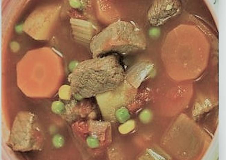 - Reduzca el calor y cocine a fuego lento sin tapar hasta que la carne esté casi tierna, aproximadamente una hora. Agregue los guisantes y la salsa picante a la sopa. Tape y cocine a fuego lento hasta que la carne esté tierna, unos 30 minutos más..